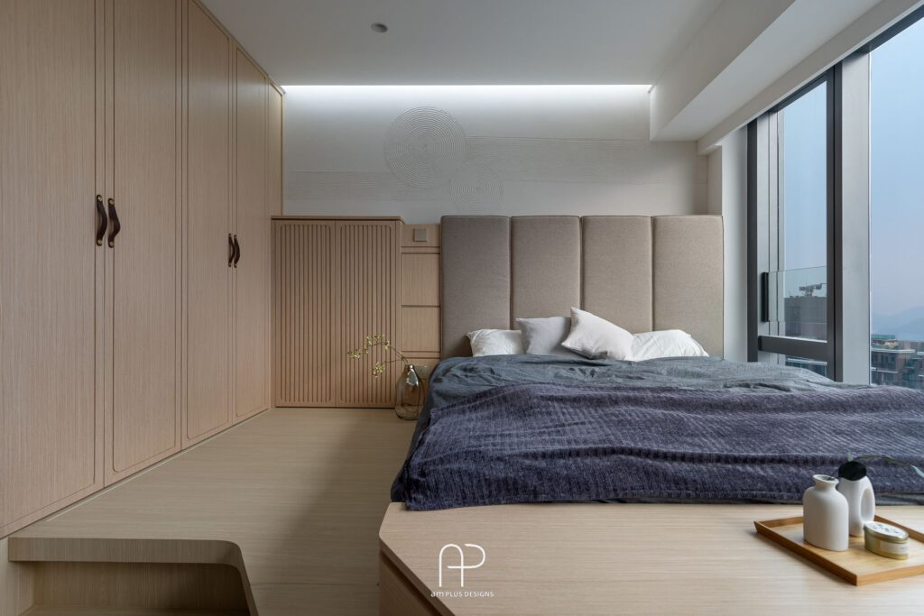 床頭的日系特色珪藻泥牆,則刻有仿照日本傳統庭園的圓與線條;特殊燈條設計也讓整體有著不同層次氛圍,流露出平靜禪意。同時空間不忘配合屋主生活習慣,利用趟摺門打造衣櫃,保有收納功能性。