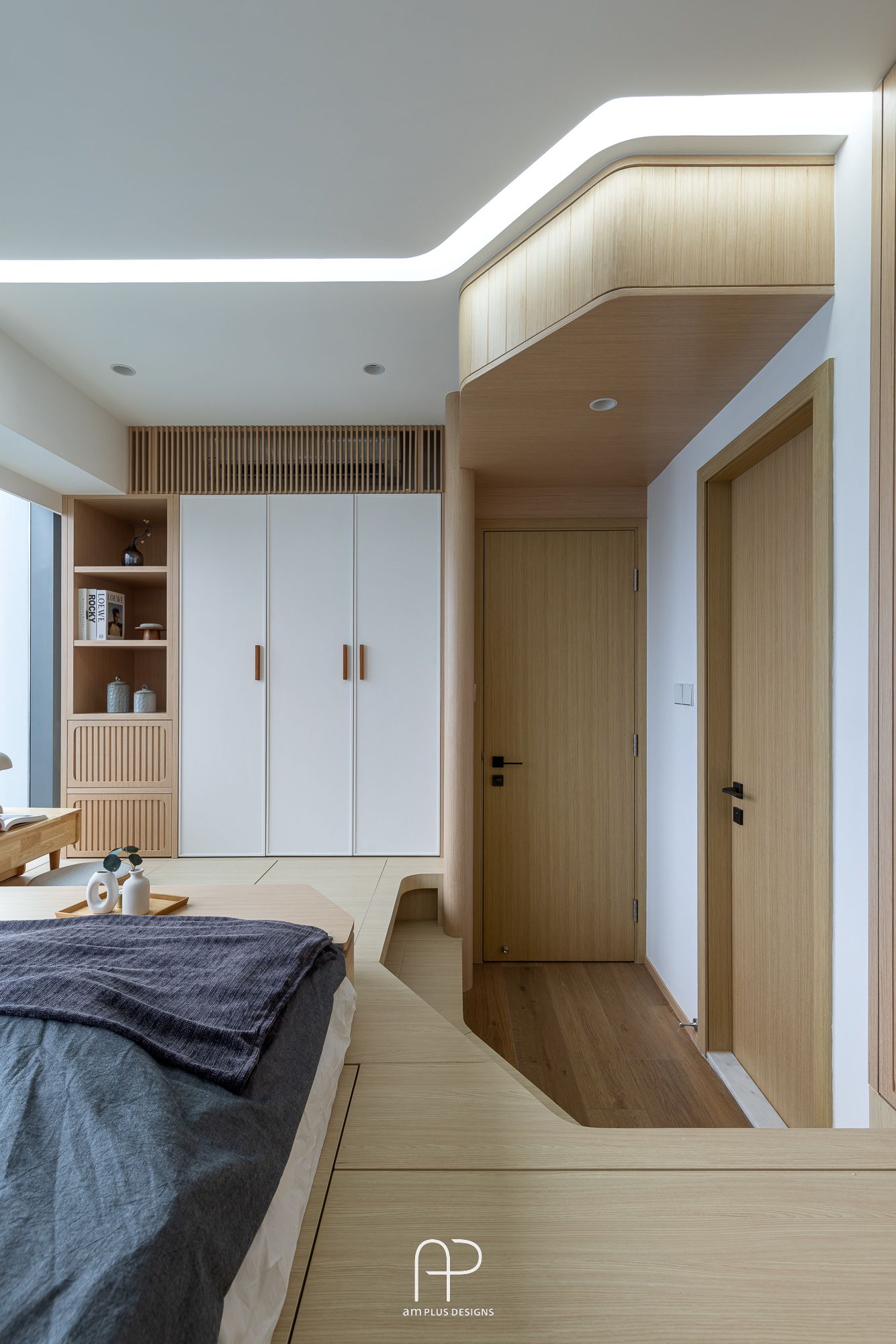 其中巧思包含帶有流水紋路感的珪藻土牆身;木條子櫃體則透過協弧邊角及燈槽設計,營造視覺輕盈效果。