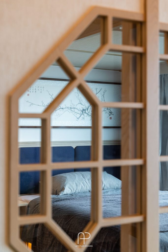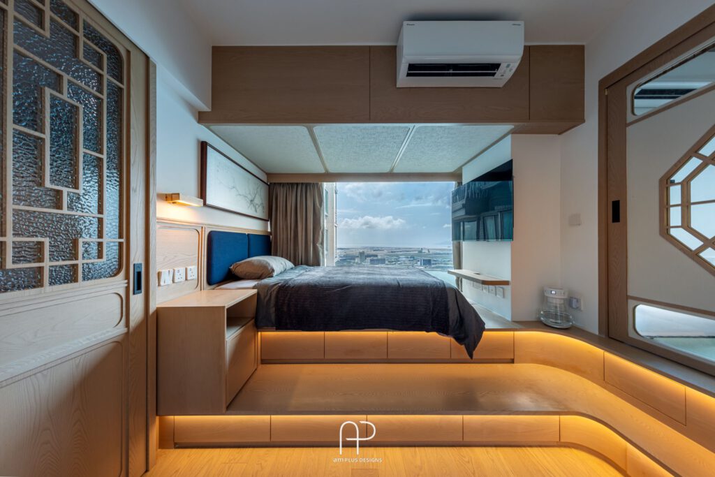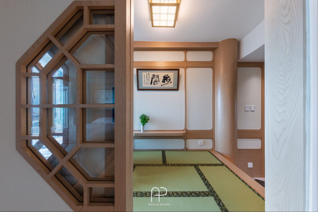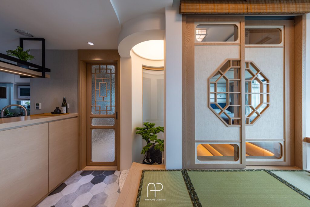 - 隱私與和諧: 設計師巧妙運用多扇拉門區隔空間, 保留居住者各自的隱私,同時維持整體空間的一致性。典雅的木製窗花更添設計巧思。