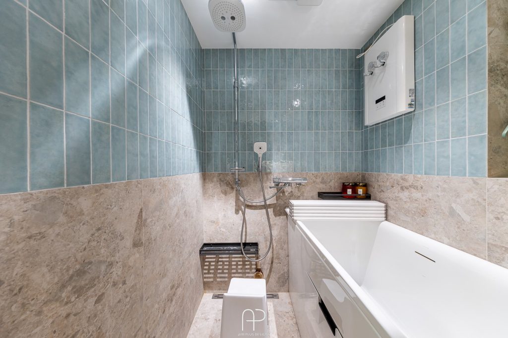 浴室以水磨石磁磚搭配湖水藍色手工磚,創造獨特的視覺效果,配合柔和的燈光和自然木質元素,為屋主打造極致舒適的個人空間。
